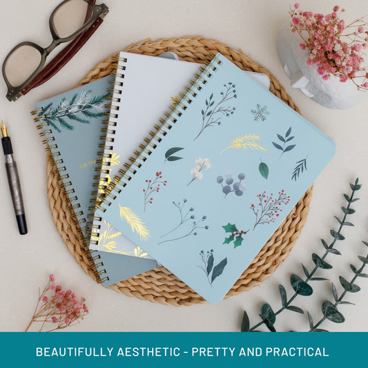 Winter Bliss Lined Spiral Notebook – White Cover with Gold Botanical Foil